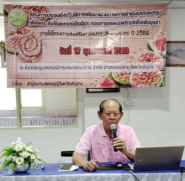 นายสมฤทธิ์ ปารินทร์ ประธานสหกรณ์การเกษตรสบปราบ จำกัด นางเจริญศรี ใจเอื้อน รองประธานสหกรณ์ นางวิมลรัศม์ วงศ์รินทร์ เลขานุการสหกรณ์ฯ นางพนัชกร เพชรชูช่วย ผู้จัดการสหกรณ์ พร้อมด้วยคณะกรรมการและเจ้าหน้าที่ที่เกี่ยวข้อง เข้าร่วมโครงการประชุมเชิงปฏิบัติการพัฒนาศักยภาพการดำเนินธุรกิจแปรรูป เพื่อยกระดับสหกรณ์สู่การเป็นผู้ประกอบการเกษตรแปรรูป เพิ่มมูลค่าสินค้า ภายใต้โครงการส่งเสริมการแปรรูปสินค้าเกษตร ปี 2569 จัดโดย สำนักงานสหกรณ์จังหวัดลำปาง กรมส่งเสริมสหกรณ์